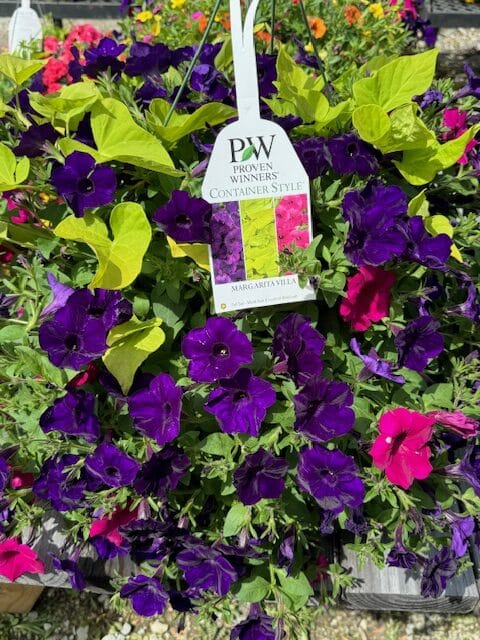 SUN Decorate your outdoor space! These HUGE Hanging Baskets are the perfect blend of vibrant blooms to keep your outdoor spaces bright and beautiful all season long. The arrangements feature Proven Winners??petunias, calibrachoa, impatiens, begonias, and so many more. Locally grown in Indiana